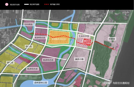 本項規(guī)劃以產業(yè)功能布局的需求為基礎,試圖通過“空間鏈”的規(guī)劃方法,將本規(guī)劃區(qū)納入核心區(qū)大醫(yī)養(yǎng)功能區(qū)中,形成開放的城市空間系統,通過交通、景觀及區(qū)劃融合的方式,促進本醫(yī)養(yǎng)社區(qū)與生命科學園、周邊醫(yī)養(yǎng)綜合區(qū)、濱海度假區(qū)之間的空間聯系和產業(yè)互動。