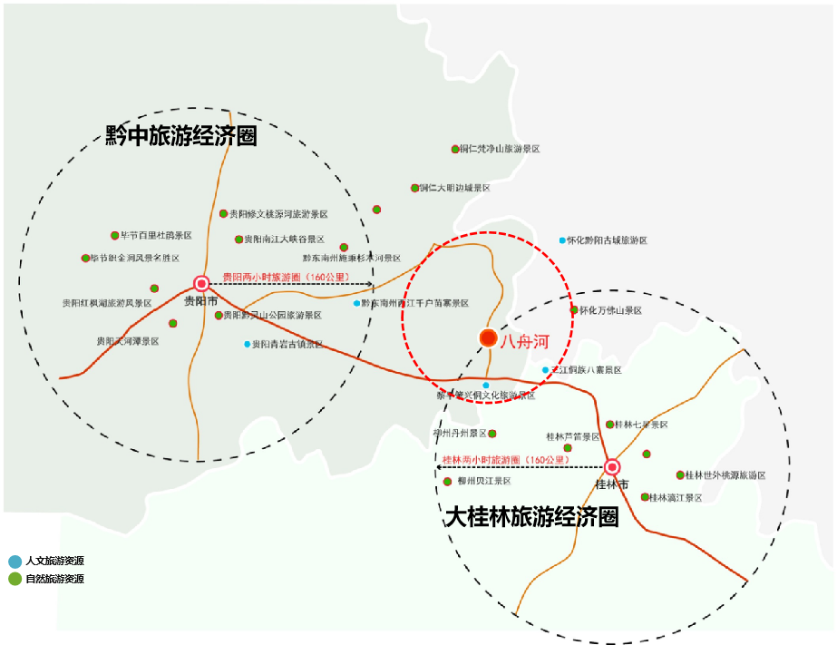 八舟河景區(qū)山水資源豐富、溪流密布,集巖溶地貌、田園溪流、河湖森林等自然景觀為一體,同時也是白茶重要產(chǎn)地之一、生長著多種異花異草、名貴中草藥材,具有很高的觀賞價值、科學(xué)價值、游憩價值。同時,項目地處黔中旅游圈層及大桂林旅游圈層兩小時旅游圈外圍,通過打造旅游度假綜合體恰好彌補了“貴州—桂林”兩小時旅游圈市場的空白。